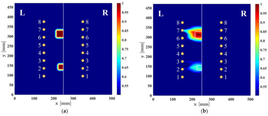 The proposed damage imaging algorithm is employed for the detection of two disbonds with different sizes in the borderline of the composite lap joint. The spatial damage intensity distribution is considered to have the resolution of 1 × 1 mm2, which corresponds to the matrix size of 470 × 500 elements. In order to assess various parameters affecting the final damage imaging results, a reference mask matrix C was designed with same dimensions as the damage imaging matrix. This mask encompasses the shapes of the two defects depicted in Figure 8a, tapered by the Tukey function from all sides, except for the side at the borderline. Minor tapering was introduced because of the Teflon films not being perfectly square in shape and experiencing some stretching during insertion. The mask serves as a reference, and all damage imaging results are compared to it to determine a correlation coefficient denoted as . It should be noted that the primary focus of this study is on the detection of delamination or disbonds in composite adhesive lap joints. Therefore, amplitudes of damage intensity distributions on the single plate (R side) are set to zero. The 2D correlation coefficient is computed using the following equation: