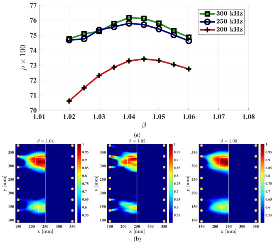 The scaling parameter controls the extent to which the elliptical probabilistic damage intensities are spread out. Depending on the size of the defect that the SHM system is targeting, this parameter can be adjusted. For the case of this study, the effect of the scaling parameter is investigated through increasing this value from to , with an increment of 0.005. In this case, three different central frequencies of the excitation were considered, the number of oriented parallel beams was , and the threshold value was set to −6 dB. Figure 9a shows the correlation coefficient obtained using different scaling parameter values. The results indicate a consistent trend across all frequencies where the correlation coefficient initially rises as the scaling factor increases, reaching its peak before subsequently declining. The optimal correlation coefficient values were achieved within the range of 1.04 to 1.05 for the scaling factor. Notably, by increasing the frequency from 200 kHz to 250 kHz, a significant change was observed, while between 250 kHz and 300 kHz, the results are very similar. Figure 9b illustrates three images obtained from using the optimum, the lowest, and the highest scaling parameter that was used in this experiment. For these damage imaging results, the excitation frequency was 300 kHz.