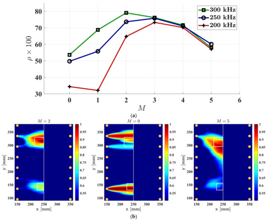In the case where no oriented parallel beams are used, the quality of imaging lacks resolution. Also, for a pair of parallel sensor arrays, increasing number of oriented parallel beams can skip extremist region as damage intensity distributions are concentrated to the center of the scan area and defects information will be buried or tend to show high amplitudes toward the center of the parallel array. To study this effect, various numbers of oriented parallel beams were considered from , where no oriented parallel beams were used, to a condition where . Similar to the previous parametric study, three excitation frequencies were employed to carry out the experiment. was considered for all damage imaging algorithms. The results of correlation coefficients for these frequencies, by varying the number of oriented parallel beams, are depicted in Figure 10a. In this figure, the same behavior is observed, which is an initial increase in correlation coefficient values, reaching an optimum point, followed by a decline. Additionally, for a lower frequency of the excitation, a higher number of oriented parallel beams was required to achieve effective damage imaging. However, in this specific structural and measurement condition, using and higher resulted in low accuracy for all excitation frequencies. Similarly, Figure 10b represents three images obtained using the optimal, lowest, and highest scaling parameters employed in this experiment. It is important to mention that these damage imaging results were obtained with an excitation frequency of 300 kHz.