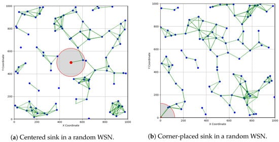 A partial connectivity comparison between a centered and a corner-placed sink in a random WSN, with sensors represented by blue dots, the sink by a red dot, and wireless links by green dashed lines. The communication range of the sink node is highlighted by a red circle with a gray shade.