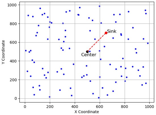 Note that and are introduced here to simulate the impact of environmental and terrain factors during deployment. For instance, a set of sensors is intended to be deployed in a designated region centered at the sink node; however, due to wind and/or terrain effects, they might eventually deviate from their intended positions by a distance of and , respectively. Consequently, the sensors are deployed at an offset distance of and from the centered sink node. Here, and represent the relative offset distance between the sink node and sensors, and a Cartesian system can be constructed accordingly, as shown in Figure 2.