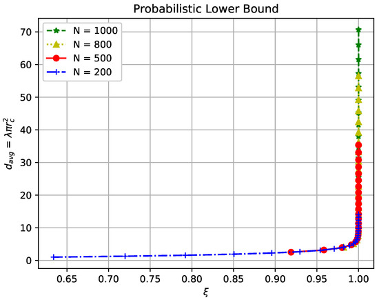 Figure 3 illustrates the critical average node degree with varying for N = 200, 500, 800, 1000, respectively. We observe in the figure that, given , the required average node degrees for all four study cases are overlapped and they increase as increases. This indicates that the critical average node degree plays a determining role in fulfilling the lower bound of sensor connectivity. Moreover, when approaches 1, the required average node degree increases sharply. This confirms the necessity of investigating the partial connectivity problem in WSNs.