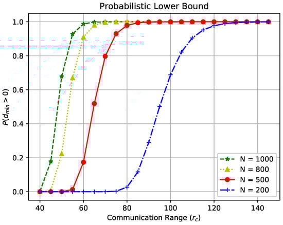 Figure 4 illustrates the probability of having no isolated sensor with the considered WSN settings, while varying the communication range from 40 m to 150 m for N = 200, 500, 800, 1000, respectively. It can be observed that there exists a critical communication range around which the probability rapidly transitions from 0 to 1 within a short interval of communication ranges, and the length of these intervals varies with the node density. For instance, in WSNs with a high node density (i.e., ), the interval is much shorter than that in low-density networks (e.g., ). Detailed results for this analysis are presented in Table 1.
