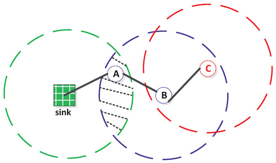 When , the sensor can only form a multi-hop communication path to the sink. On the one hand, it can reach the sink in two hops like sensor B (using A as a relaying node), as illustrated in Figure 5. Specifically, the required conditions for a sensor like B to be two-hop-connected are: