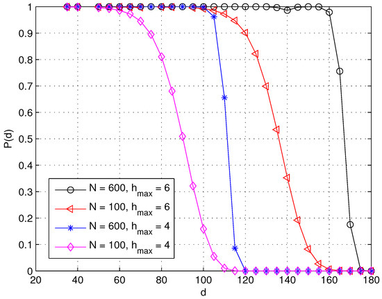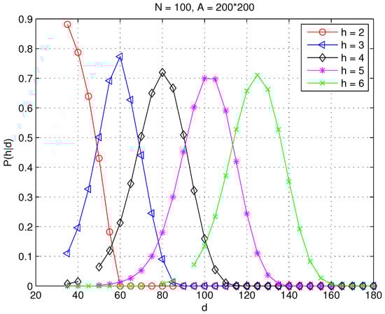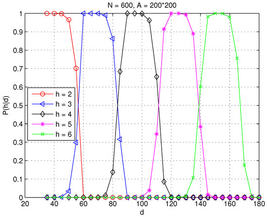 As to the second condition, the probability that at least one sensor is located in sensor s’s communication range and the sensor is connected to the sink in exactly hops can be computed as , where and . Consequently, the probability that a sensor at distance d is connected at a hop distance of can be computed recursively via [27,41]: