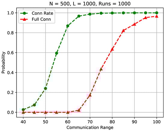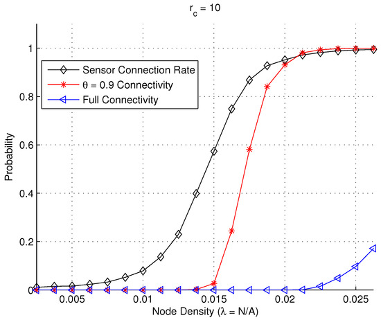 Impact of the communication range () on the sensor connection rate and full connectivity.
