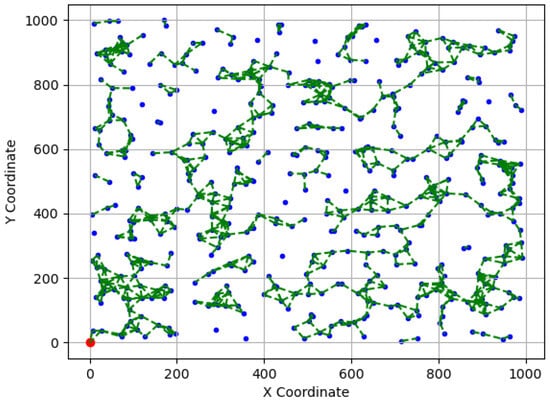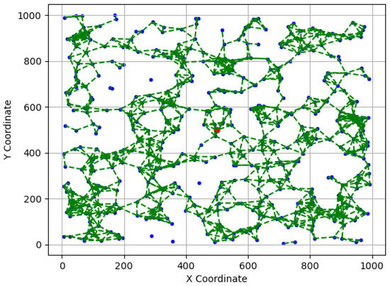 Based on an ad hoc network model, Dousee et al. [13] illustrated the considerable cost associated with achieving full connectivity and the detrimental impact of poor network properties like the transport capacity. They also showcased that a slight relaxation of the full connectivity requirement to a partial -connectivity, where only a given fraction the nodes is connected, can significantly conserve network resources while enhancing the overall performance. Dousse et al. [14,15] extended this perspective by demonstrating that full connectivity does not scale well with the network size and that maintaining partial network connectivity leads to an optimal network throughput. Cai et al. [16] demonstrated that a large number of extra sensors are required to connect a small fraction of isolated sensor(s) for full connectivity. More specifically, they showcased that there exists a critical sensor density , around which the probability that at least a fraction of sensors are connected in the network increases sharply within a short interval of node density . Recently, Fu et al. [7] considered the role of the sink node in the network load distribution and presented a sink-oriented cascading model along with the MA-TOSCA algorithm to enhance WSNs’ resistance to cascading failures through topology optimization. By considering border effects based on a binary disk connectivity model, Hoyingcharoen et al. [17] developed an analytical formula to determine the expected degree of sink connectivity for homogeneous sensors that are unable to transmit directly to the sink.