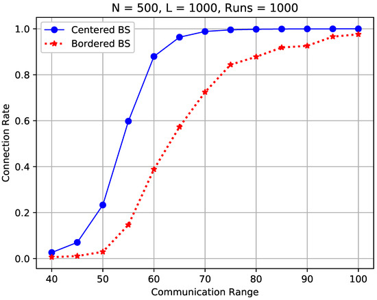 Figure 13 compares the sensor connection rate of the considered WSNs with a centered sink and a bordered sink. In this study, 500 sensors were randomly scattered in the FoI for all cases, and the communication range was varied from 40 m to 100 m to simulate different ranges of sensors.