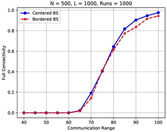 Figure 14 compares the full connectivity of the same experiments as depicted in Figure 13. Different findings are uncovered. To be specific, the full connectivity of the studied WSNs with a centered sink nearly overlaps with the counterparts of a bordered sink, as shown in Figure 14. This means, the position of the sink has negligible influence on the full connectivity in the considered WSNs. This is because in a fully connected WSN, all sensors including the sink should be connected, no matter where the node is located. This also explains why very little work has taken into consideration the impact of sink placement on the full connectivity of random WSNs in the current literature.