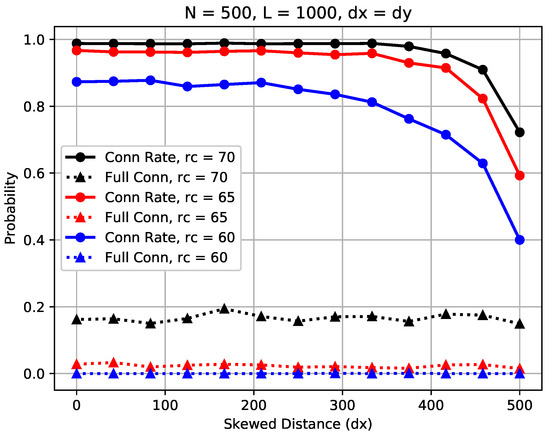 On the one hand, we observe in the figure that the skewed distance has a noticeable impact on the sensor connection rate for all three considered communication ranges. We also observe that there exists a critical skewed distance , around which the sensor connection rate in the network drops quickly from the upper bound to the lower bound, and the critical skewed distance differs when network settings vary. For m, as shown in the figure, when the skewed distance increases from 0 to 250 m, the sensor connection rate is constant; however, it drops quickly when exceeds 250 m. On the other hand, it is shown that the skewed distance has little impact on the full connectivity. This is because all sensors, regardless of their locations, should be connected in a fully connected WSN.