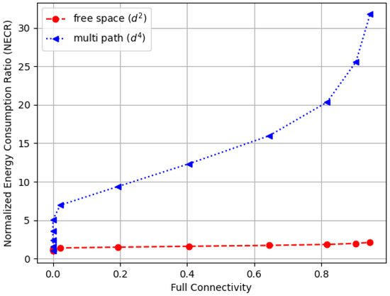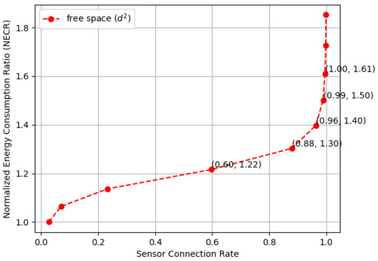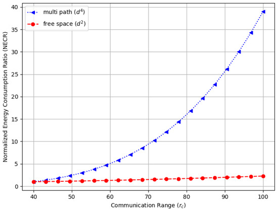 The normalized energy consumption ratio (NECR) for the free space environment in a random WSN with a varying communication range ().