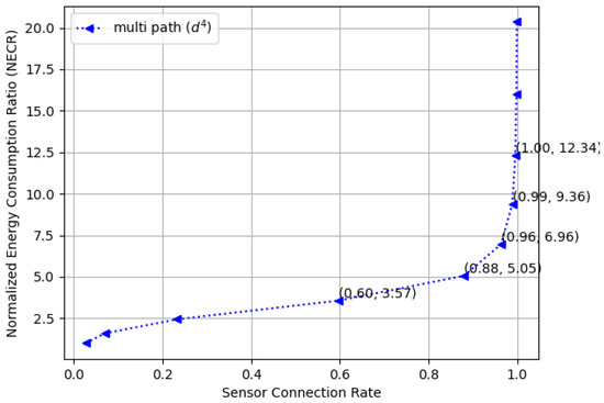 Figure 18 compares the normalized energy consumption ratio (NECR) in both free space and multi-fading environments while varying the full connectivity requirements, and similar trends were observed. Moreover, Figure 19 and Figure 20 illustrate the tradeoffs between the sensor connection rate and the normalized energy consumption ratio (NECR) for free space and multipath fading, respectively. We observe that to increase the sensor connection rate slightly from to , an additional and more energy are required for free space and multipath fading, respectively, while keeping other parameters constant.