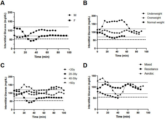 The Impact of Sex, Body Mass Index, Age, Exercise Type and Exercise Duration on Interstitial Glucose Levels during Exercise