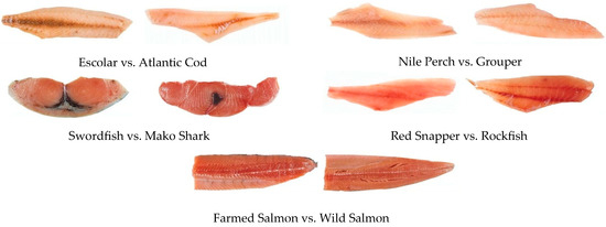 Seafood mislabeling has been reported in numerous studies globally. In a large-scale study, the nonprofit group Oceana found that 19% of fish sold in 55 different countries within all sectors of the supply chain were labeled as an incorrect species [1]. Fish mislabeling and fraud pose a grave threat to both consumers and the environment. The issue of illegal, unreported, and unregulated (IUU) fishing exacerbates this problem further, due to ineffective and inefficient fish assessment methods in the supply chain. Various deceptive practices are employed in fish fraud, including substituting expensive fish species with cheaper alternatives, falsely labeling frozen-thawed fish as fresh, misrepresenting the production method (such as claiming fish as wild-caught when it is actually farmed-raised), and falsifying the geographical origin of fish [2]. The risk of fish fraud is particularly high in fish fillets and portions, since they lack distinguishing features after processing, making it easy for fraudsters to deceive unsuspecting customers (Figure 1).