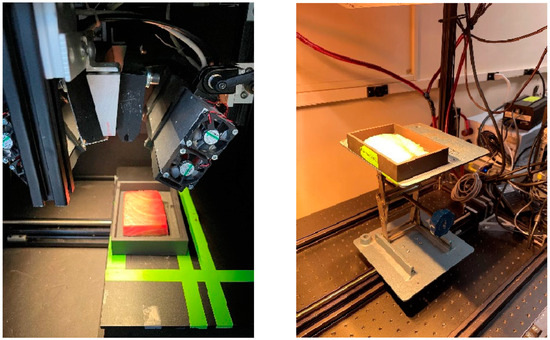 The fish fillets were placed in customized sample holders created by a 3D printer using black thermoplastic. Each sample holder had an area of 150 × 100 mm2. Additional plates were printed to sit within the holder under the samples. Each sample rested on top of the plates within the holder to ensure consistent distance between samples and camera. Rust-Oleum black paint was applied to the sample holders and the plates to remove glare (Figure 2).