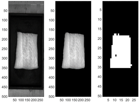 Data collection and processing are shown for a sablefish fillet. The raw VNIR image (left), with a mask applied to remove the background (center) and voxels of 10 × 10 pixels are formed with outliers removed (right), with the third-dimension denoting wavelengths, which are not displayed in this figure, as the images are taken from the 29th band (552 nm). Valid voxels are shown in white.
