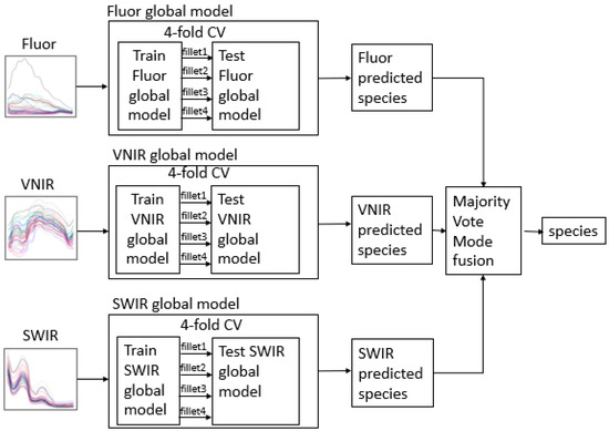 Hybrid fusion model where the global model was trained on all species, with the dispute models for each spectroscopic mode determining predictions for spectrally similar fish groupings. A final majority vote occurred to give a final prediction.