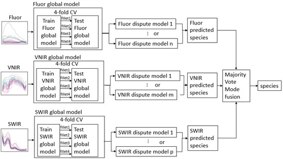 To fuse the three different predictions from each spectroscopic mode, each of the three modes entered a majority voting system, where the species prediction with the most votes is output as the prediction of the global fusion model. Each spectroscopic mode was treated independently in developing its dispute model set. Therefore, each of the three spectroscopic modes has its own hybrid (global + dispute) model.