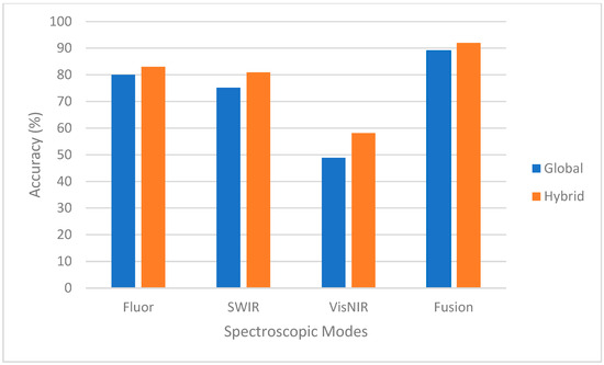 Accuracies for global and hybrid models for single spectroscopic modes and fusion.