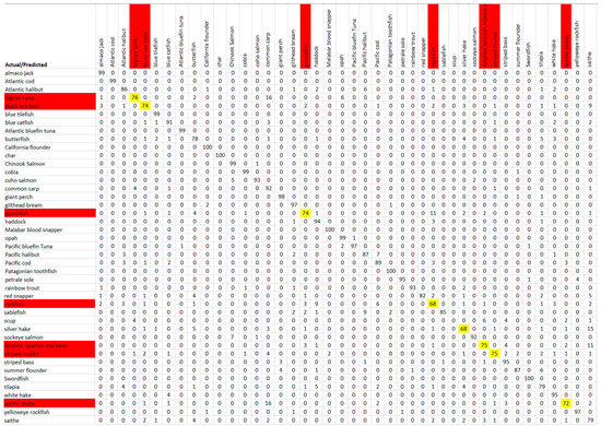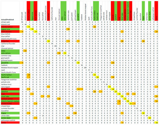 Table 4, Table 5 and Table 6, and Figure 11, Figure 12 and Figure 13 display which low-performance species were grouped with the corresponding commonly misclassified species, as well as the improvements in the accuracy for each subgroup. Figure 14 shows the confusion matrix for the fused hybrid model.