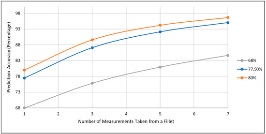 Improvement in species prediction accuracy for a fillet as the number of measurement points increases for fillets with 68%, 78% and 80% single-point measurement accuracy.