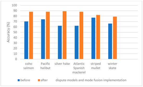 Accuracies before and after the implementation of dispute models and mode fusion.