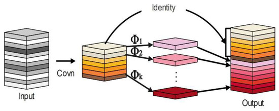 Han et al. [30] presented an innovative lightweight module, termed “Ghost” derived from the GhostNet architecture. Notably, this module can produce an augmented number of feature maps, utilizing fewer parameters and computations. For an input feature , where denote the width, height, and number of channels of the feature map, respectively, the operation of the Ghost module proceeds in the following sequence. A collection of feature maps is initially extracted via standard convolution, as detailed in Formula (1). These feature maps subsequently undergo a linear transformation to yield additional or “ghost” feature maps derived from the preceding maps. The primary and the “ghost” feature maps are then concatenated along a designated dimension, resulting in the final output, as articulated in Formula (2). The core motivation behind the Ghost module’s design is to curtail the computational overhead associated with traditional convolutions without compromising on accuracy. This operational framework is graphically depicted in Figure 2.