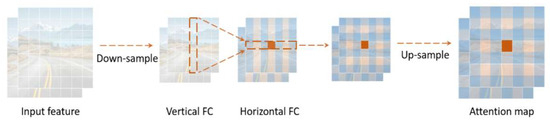 In Formula (3), is element-wise multiplication, represents the learnable weights in the FC layer, and is the generated attention map. Since all locations (represented in ) contribute to the computation of the attention output for each location, the global information is captured by combining all tokens using learnable weights. In addition, since CNN features are 2D, the FC layer can be computationally simplified by exploiting this 2D structure, as shown through the decomposition in Formula (3). Specifically, Formula (3) can be decomposed into two FC layers that aggregate features along the horizontal and vertical directions, respectively. This can be expressed as: