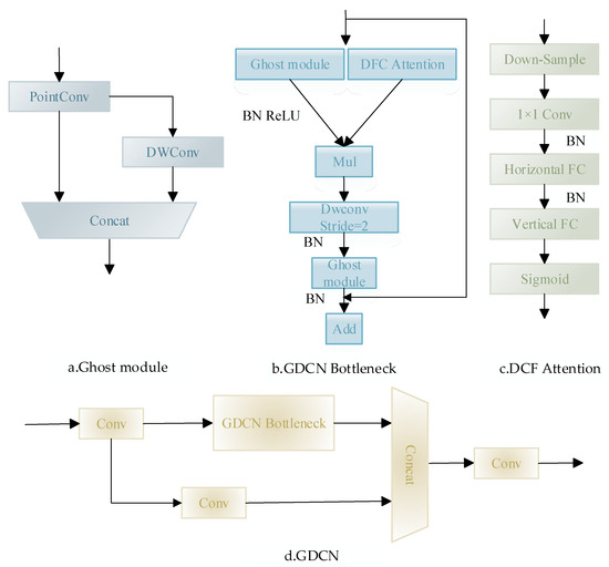 We present the GDCN module, leveraging the Decoupled Fully Connected (DFC) attention mechanism. Drawing inspiration from both the Ghost module and the DFC attention mechanism, Figure 4 illustrates the design and intricacies of the GDCN module. Significantly, the GDCN Bottleneck, an innovative fusion of the Ghost module and the DFC attention mechanism, supersedes the conventional C3 Bottleneck within the neck network. This integration births the novel GDCN network. The inception of the GDCN network leads to a reduction in computational demands, a decrease in model dimensions, and a substantial improvement in detection precision. This pioneering strategy harnesses the combined potential of the Ghost module and the DFC attention mechanism, ultimately establishing the pivotal GDCN module, which amplifies the overall effectiveness of the GDCN network.