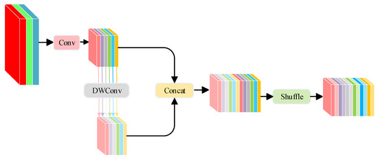 As illustrated in Figure 5, the GSConv module adopts a shuffle strategy to disseminate the information derived from the SC throughout the data generated by the DSC. This shuffle technique is characterized by a uniform mixing approach, ensuring that information from the SC is seamlessly integrated into the DSC’s output through the consistent swapping of local feature details across different channels. The procedure is streamlined, with no added computational demands.