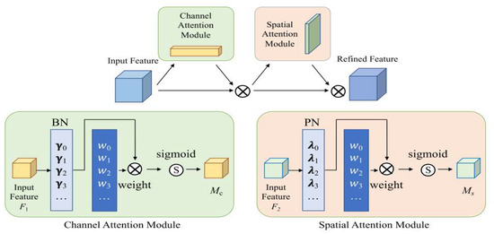 The design approach used in the channel attention module has also been applied in the spatial attention module. Here, the pixels in the spatial dimensions go through BN processing, which is also known as Pixel Normalization (PN). PN focuses on the more informative pixels and adjusts the associated weights accordingly based on the scaling factor . If is the input feature map, where denote the height, width, and number of channels, respectively; then, the output of the spatial attention model, , can be expressed as Formula (9):