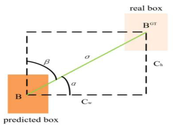 In the formula, is the difference in height between the centroids of the real box and the predicted box, is the distance between the centroids of the real box and the predicted box, is the center coordinate of the real box, and is the center coordinate of the predicted box.