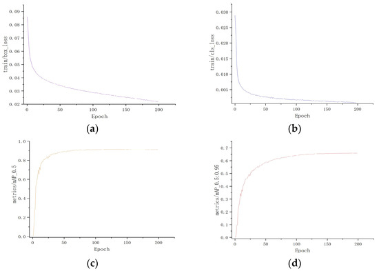 Model training result curves: (a) is the train/box_loss curve, (b) is the train/cls_loss curve, (c) is the mAP0.5 curve, and (d) is the mAP0.5:0.95 curve.