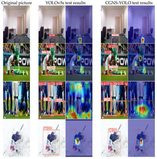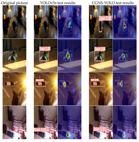This study undertook visual analyses to delineate the disparities in fall detection performance between the original YOLOv5s and the CGNS-YOLO algorithm across diverse settings, encompassing variable lighting conditions and occlusion instances. The culminating visual findings are portrayed in Figure 11 and Figure 12. Every test image set comprises three components: the left-most image presents the authentic photo, whereas the central pair of images depict the detection outcomes of the original YOLOv5s algorithm alongside their respective GradCam visualizations. In parallel, the rightmost pair illustrates the detection results of the CGNS-YOLO algorithm, complemented by their corresponding GradCam visualizations.