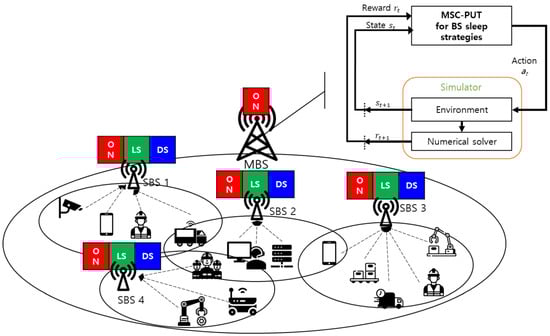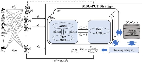 SBS maintains an active state but enters a light SM when it is in an idle state without transmitting data. Furthermore, the agent in MBS makes decisions about SBSs’ deep SM by using reinforcement learning based on the PPO algorithm in order to maximize energy efficiency and applies it to the network. Note that MBS is constantly active in order to guarantee IoT service in the MSC-PUT strategy.