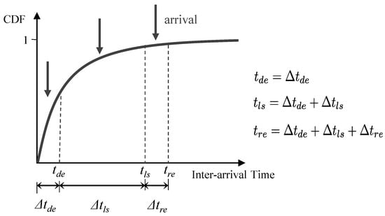 The light SM latency is caused by the light SM status of BSs. The light SM period of BSs is composed of a deactivation period, a light sleep period, and a reactivation period. Figure 2 presents a cumulative distribution function (CDF) of the inter-arrival times. On the x-axis, the sequence of the BS states visited during a light SM period is reported. In particular, the labels , , and on the x-axis identify the ending time of deactivation from the active state, the ending time of the light SM state, and the ending time of the reactivation state, respectively. In addition, the labels , , and represent the duration of each state in the light SM period, respectively.