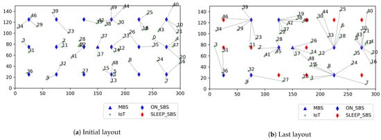 In this section, we present the evaluation of the performance of the proposed MSC-PUT algorithm using the Python and the PyTorch library for the PPO algorithm implementation [26]. Our simulation considers an indoor factory IoT scenario where M SBSs are deployed over one MBS and serve moving K IoT devices. The total 18 SBSs are located on the square lattice with spacing 50 m between SBSs and 25 m from the walls in the 300 m by 150 m sized hall as the indoor factory scenario in [29]. The MBS is located at the center of the hall, and it is always in active mode. The simulation layout is presented in Figure 4. The text in Figure 4 denotes the pairs of IoT devices’ ID and BS’s ID, which represent the connection between the IoT device and the BS. The IoT devices move freely at a constant speed of 1 m/s in the hall and send collected data through the uplink. We assumed that IoT devices collect 1 Mbit of data per second. Thus, IoT device k sends the size of 1 Mbit/ burst data to the connected BS, where the arrivals of the burst data follow the Poisson process and is the average number of arrivals.