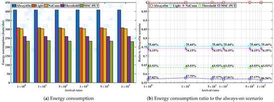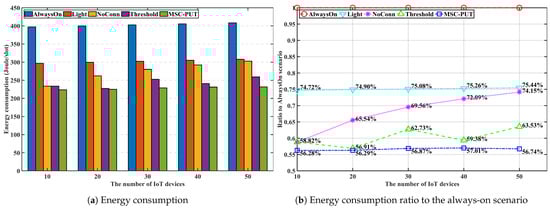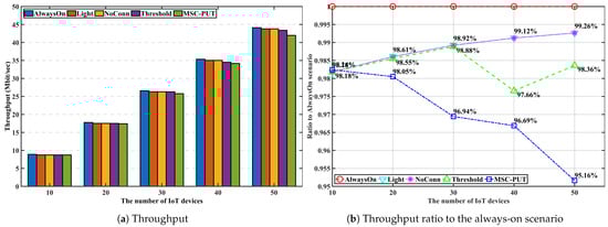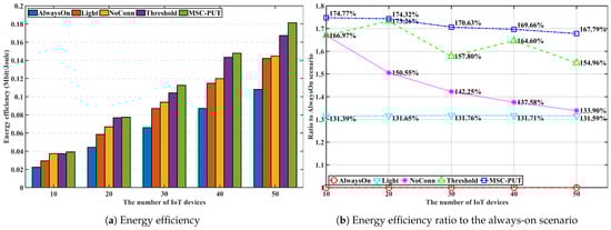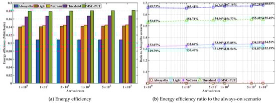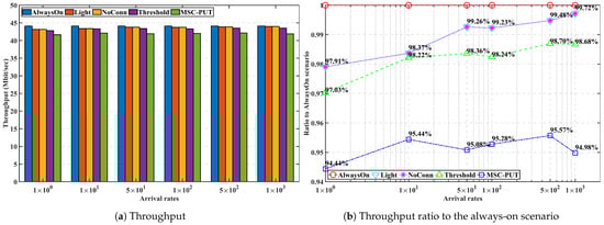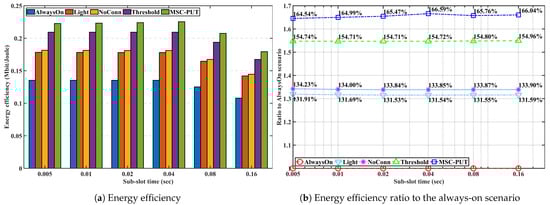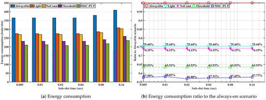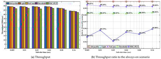 Due to the effect of longer light sleep duration in Figure 12, the relative throughput performance of Light and NoConn degrades as sub-slot time increases. On the other hand, the relative throughput performance of Threshold and MSC-PUT tends to improve as the slot time grows. This happens because a handover results from BSs’ deep sleep, which causes an aggregated arrival rate and reduces average light sleep time. The energy consumption is dependent on the number of IoT devices, the same as the previous performance by arrival rates. Therefore, slot time has no impact on the performance of energy consumption.