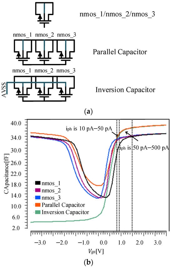 As shown in Figure 2a, three MOS capacitors with width and length of 3 µm are used, and the MOSFET types are nmos_1, nmos_2, and nmos_3, respectively. The three capacitors have the same thickness of gate oxide layer, all of which are 7.03 nm, and different threshold voltages, which are 0.62 V, 0.4 V, and 0.3 V, respectively. The simulation is carried out at 25 °C and the tt process corner. MOS capacitance values with Vgs are shown as black, purple, and blue curves in Figure 2b. It can be seen that the capacitance values of these three types of capacitors are similar in the strong inversion and accumulation regions. In the inversion region with variable capacitance values, the curves of capacitance values versus Vgs for all three types of capacitors have steep slopes, and the Vgs region with variable capacitance values is very small. Therefore, they cannot be used directly as adaptive integrating capacitors for highly dynamic pixels.
