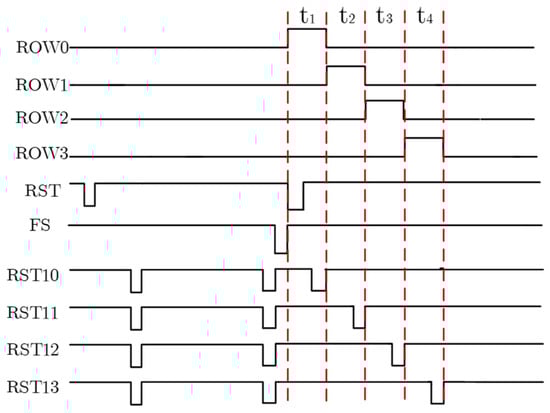 As can be seen from Figure 4, in the reset stage, RST is used as the global reset signal, which is low level first, resetting the integrating capacitor node PD. Then, the RST10-RST13 are low level at the same time to reset the transferring capacitor node FD. Secondly, the signal FS is low level to transfer the charge. Finally, in the readout stage, ROW0-ROW3 are high-level one after another during t1-t4, indicating that the signal voltages are read out row by row. The column bus voltage of pixels drops and the signal voltages are displayed. After that, RST10-RST13 are low level row by row, the column bus voltage of the pixel increases, and the reset voltages are displayed. The post-stage circuit uses CDS technology to sample signal voltages and reset voltages.
