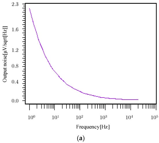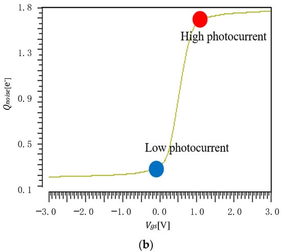 The noise frequency domain curve of the pixel is shown in Figure 7a. The adaptive infrared pixel noise is mainly a low-frequency signal, such as flicker noise. The noise is 7.45 µV/Hz. According to Equation (3), due to the use of an adaptive capacitor, the equivalent number of noise electrons at different Vgs changes with the change of capacitance value. The curve is shown in Figure 7b. According to Equation (6), the blue dot in the figure represents that under low light conditions, Vgs is 0 V and the noise is only 0.3 e−. The red dot in the figure represents that under high light conditions, Vgs is 1 V and the noise is 1.8 e−. It can be seen that the equivalent number of noise electrons increases with the increase in light intensity. It achieves excellent performance with low noise in low light.