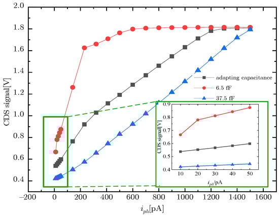 To study the change in capacitance value of the adaptive integrating capacitor under different light intensities, the pixel CDS signals using the adaptive integrating capacitor and a fixed capacitance value capacitor as the integrating capacitor is compared. The curve of CDS signal variation with photo-current is shown in Figure 8. The black curve in Figure 8 shows, an adaptive capacitor used as an integrating capacitor, CDS signal change with photo-current. For 5T infrared pixels with 6.5 fF and 37.5 fF fixed capacitors, the curve of the CDS signal is in red and blue, respectively.