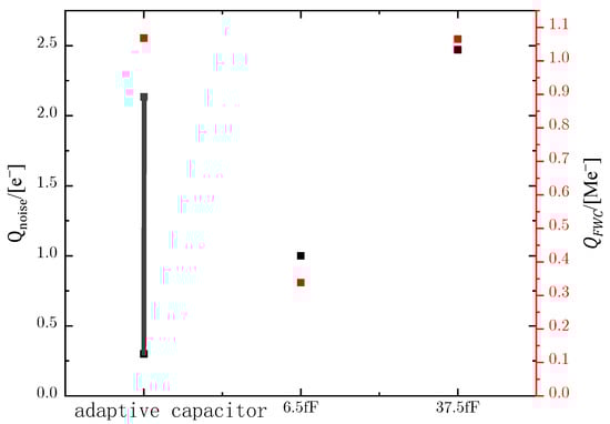 To study the effectiveness of the adaptive integrating capacitor in reducing noise and increasing FWC, the pixel noise, and FWC with the adaptive capacitor are compared with those with a fixed capacitor. According to Equations (2) and (3), the noise and FWC of 5T pixels with different capacitors are shown in Figure 9.