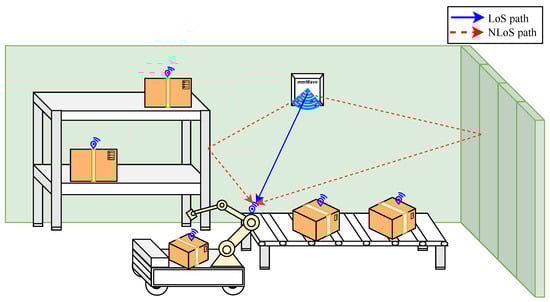Figure 1 illustrates a typical Industry 4.0 scenario in a smart warehouse where a forklift moves products from the conveyor belt to the shelves. In such a scenario, the localization and tracking of the forklift can be achieved using geometry-based methods, which rely on accurate estimation of localization parameters [5,17].