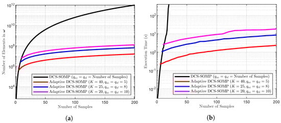 Comparison between DCS-SOMP and Adaptive DCS-SOMP: (a) Variation in Sensing Matrix Size (Number of Elements) and (b) Execution Time, both regarding the number of samples.