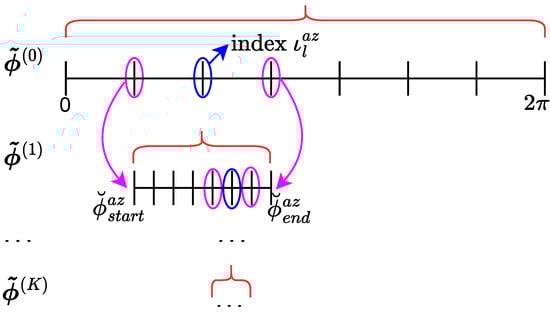 We introduce an adaptive approach to enhance the parameters estimated in the two aforementioned stages: (1) sensing matrix construction and (2) application of the DCS-SOMP approach for 3D parameter estimation. Our method dynamically adapts the search space for each angle to be estimated, i.e., 2D-AoD and 2D-AoA. To illustrate how dynamic adaptation is performed, Figure 3 demonstrates the improvements made in each iteration using our adaptive approach for the azimuth AoD angle. In summary, in iteration k, the search interval () is dynamically adapted using the index () of the previous search interval (). New parameters are estimated in each iteration. The process continues until a predetermined number of iterations (K) is reached or a pre-established threshold () is exceeded.