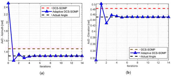 Comparison of (a) Azimuth AoD estimation and (b) Elevation AoD estimation results using DCS-SOMP and adaptive DCS-SOMP. The outcomes pertain to Path 1. In the DCS-SOMP case, and are both set to 18, whereas in the adaptive DCS-SOMP scenario, and are both set to 6.