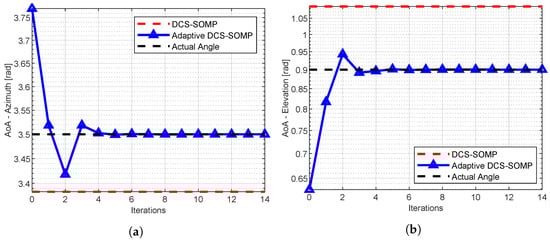 Comparison of (a) Azimuth AoA estimation and (b) Elevation AoA estimation results using DCS-SOMP and adaptive DCS-SOMP. The outcomes pertain to Path 1. In the DCS-SOMP case, and are both set to 18, whereas in the adaptive DCS-SOMP scenario, and are both set to 6.