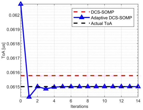Comparison of ToA estimation results using DCS-SOMP and adaptive DCS-SOMP. The outcomes pertain to Path 1. In the DCS-SOMP case, and are both set to 18, whereas in the adaptive DCS-SOMP case, and are both set to 6.