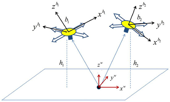 where represents the acceleration in body frame. denotes the acceleration value provided by the accelerometer adhering to the vehicle body. and denote the Gaussian noise and the bias of the accelerometer, respectively. represents the gravity vector. could be calibrated either off-line or on-line [19]. It is not considered in this paper and the measured acceleration is regarded as non-bias. Note that because the body frame is a non-inertial frame, obtaining the complete relationship between and should take consideration of inertial acceleration, as shown in [25]. However, since the motion of the vehicle is not rigid during hovering flight, inertial acceleration is usually omitted to simplify the model in many papers, such as [22,26,27]. This simplification is adopted here and (2) is obtained.